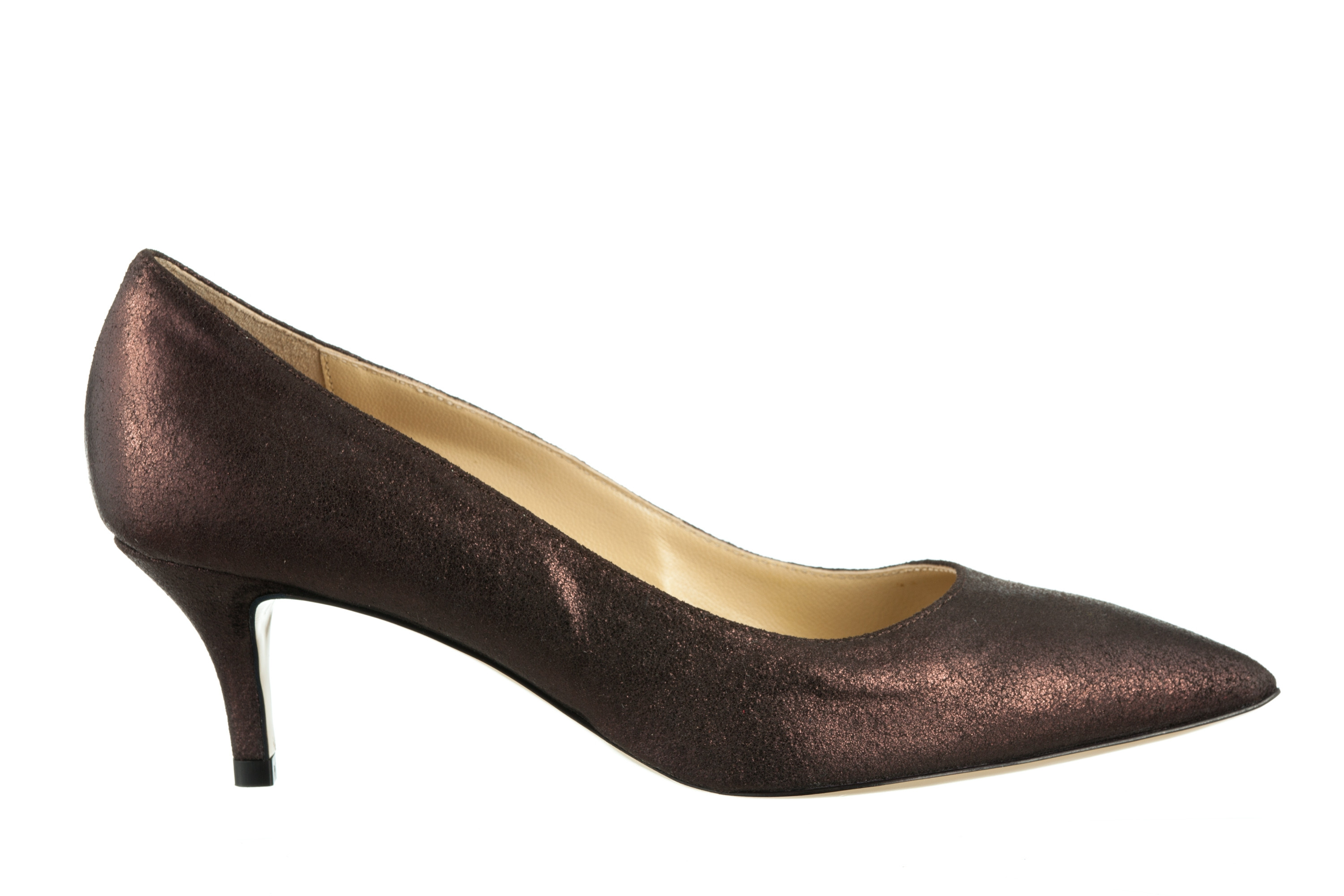 Decoltè a sacchetto in morbido camoscio laminato bronzo. Fodera vera pelle. Tacco 5 cm ricoperto in pelle. Suola cuoio naturale.