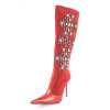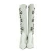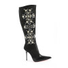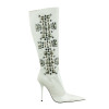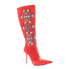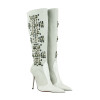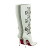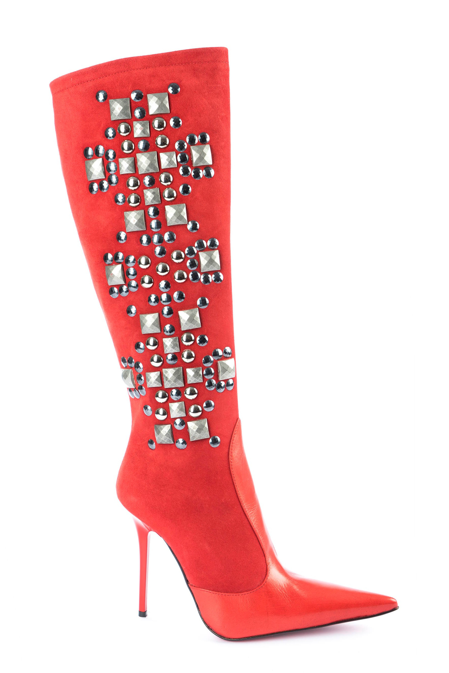 Stivale altezza ginocchio realizzato in vitello, con gambale in camoscio e borchie colore nichel. Suola tunit rossa con stampa floreale nera. Disponibile nelle varianti colore: rosso, nero e bianco.