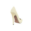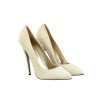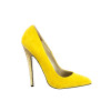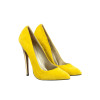 Decolletè in camoscio, senza plateau. Disponibile nelle varianti: camoscio giallo e tacco ricoperto in pelle oro stampata cocco, camoscio ghiaccio e tacco ricoperto in pelle bianca stampata cocco o camoscio sabbia e tacco ricoperto in pelle satinata sabbia. Tacco a spillo, altezza 15 cm. Suola tunit rosa.