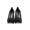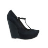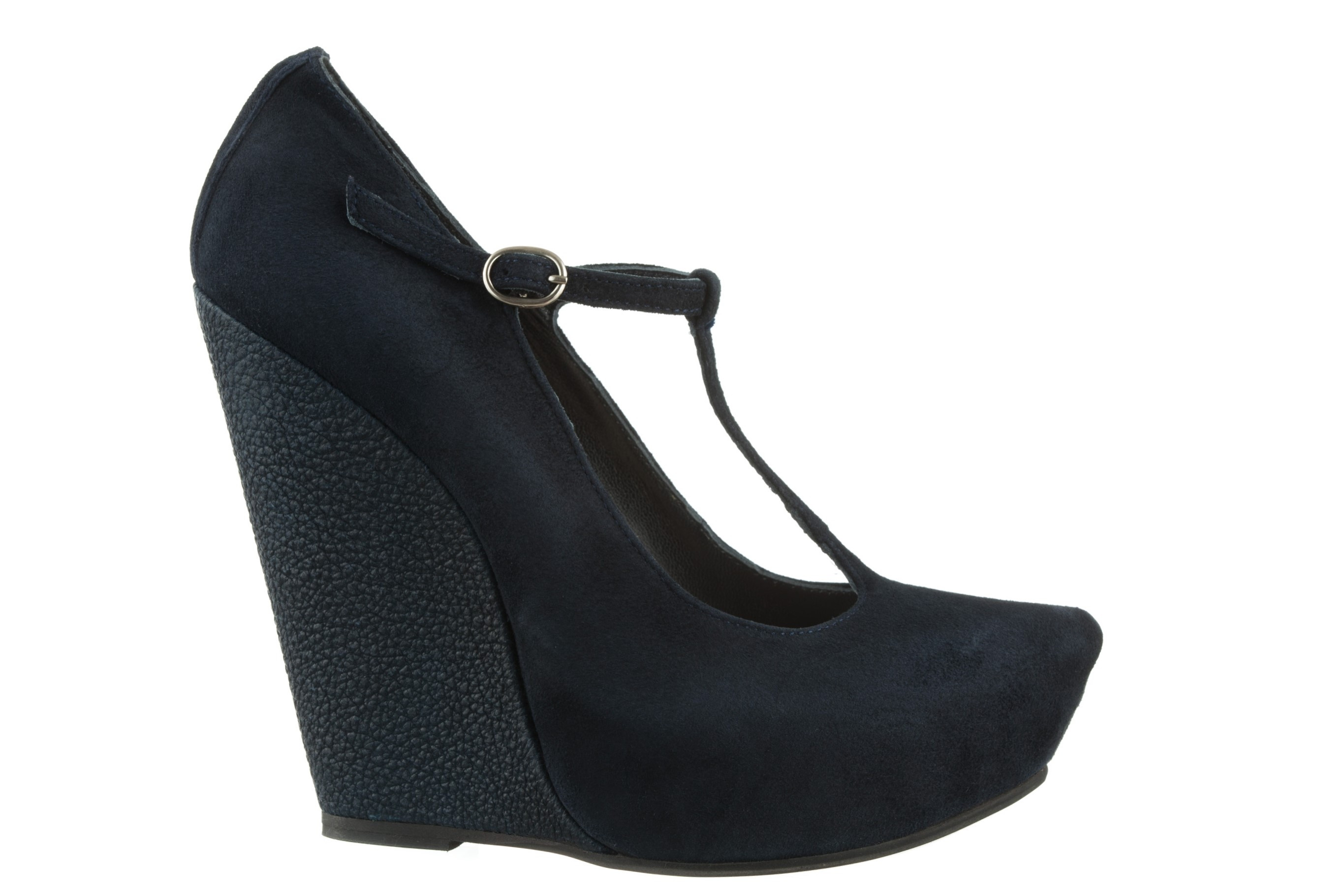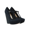 Scarpa con cinturino stile Charleston in vera pelle scamosciata blue e fibbia nickel. Pleateau interno 2 cm e zeppa ricoperta in vera pelle martellata bleu. Suola tunit rosa.
