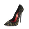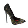Decolletè in camoscio nero con applicazione di strass e borchiette bianche e oro. Tacco laccato nero. Suola tunit rossa con stampa floreale nera.
