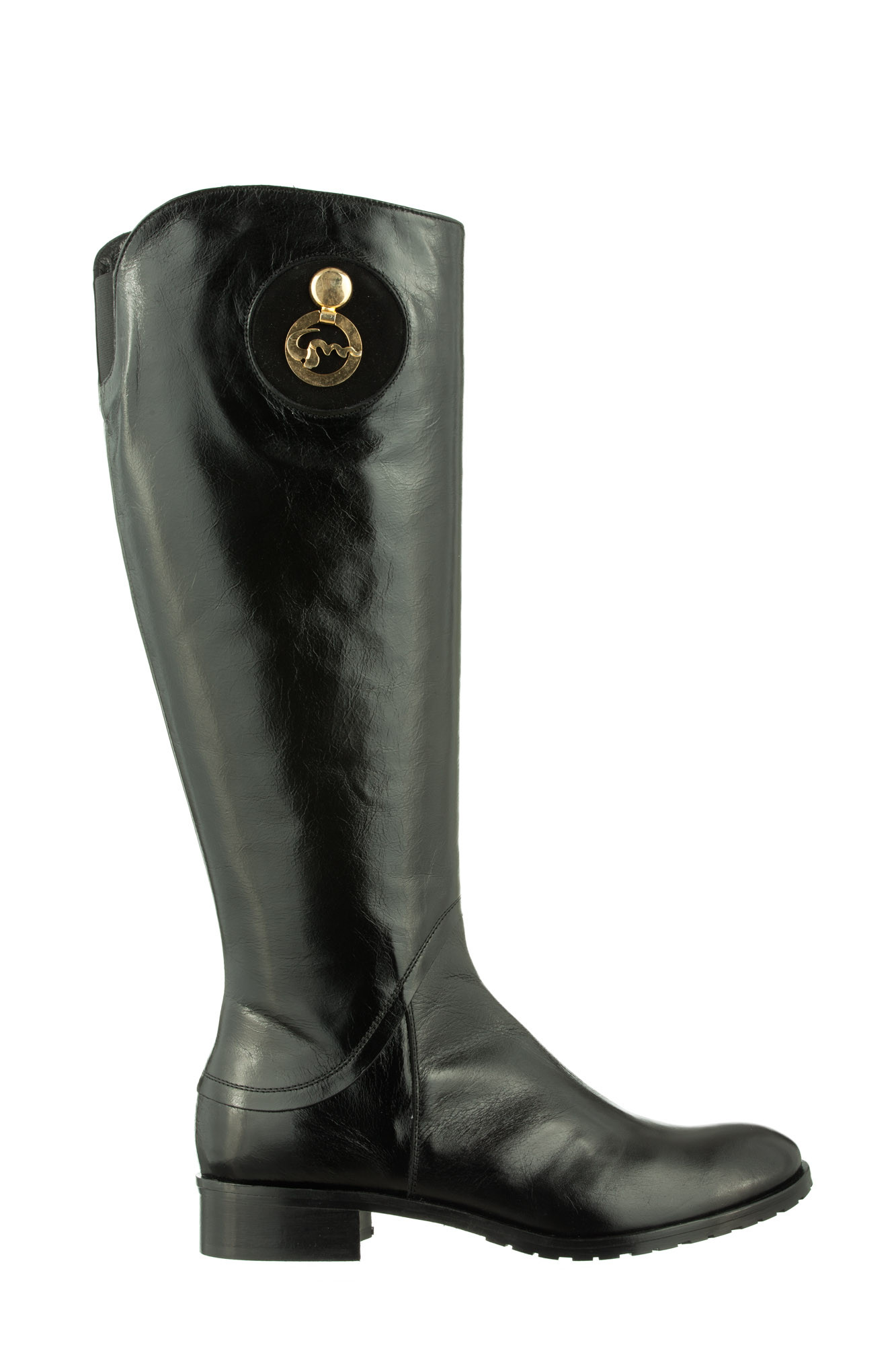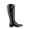 Stivale in vitello nero altezza sotto al ginocchio. Tacco cuoio altezza 3 cm. Fondo tunit nero mezza gomma. Accessorio laterale Gianrico Mori oro.