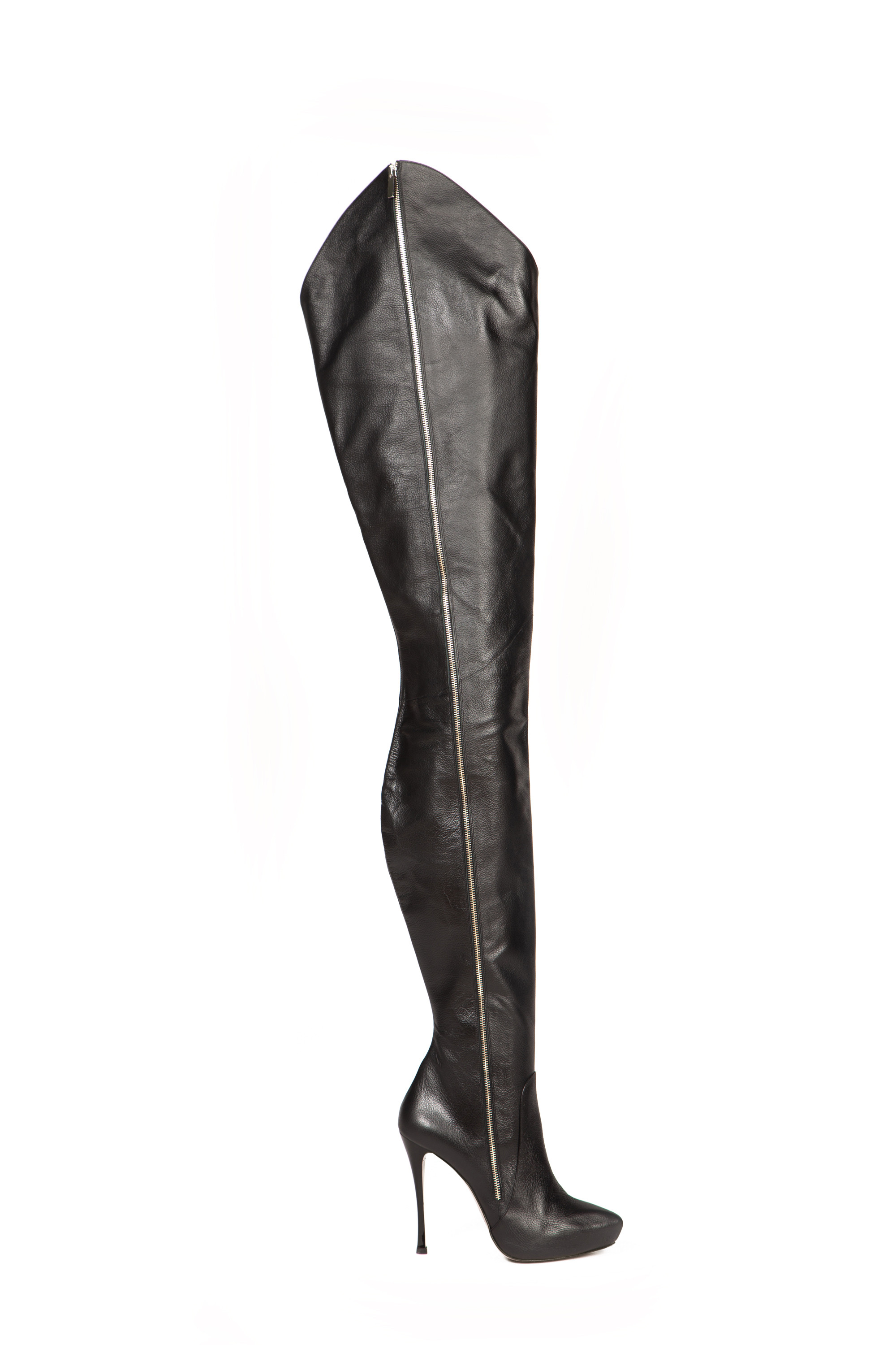 Stivale a coscia in pelle bottalata con zip esterna funzionale in metallo.