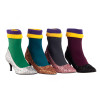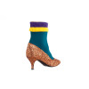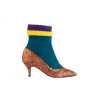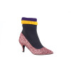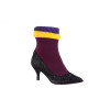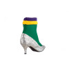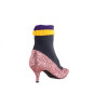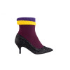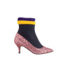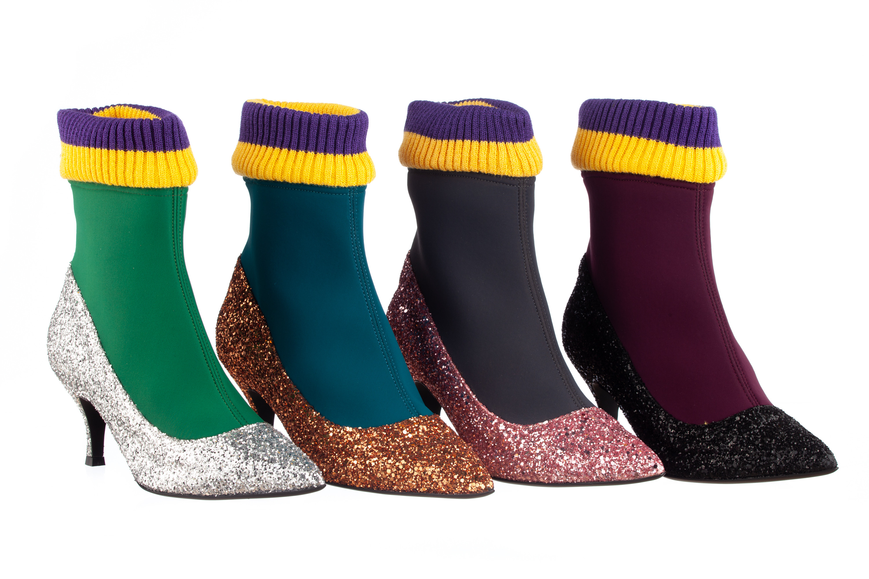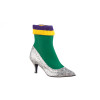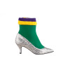 Tronchetto in tessuto elasticizzato con decollete' in glitter e calza lana giallo e viola. Disponibile nelle combinazioni colore: -Tessuto Vinaccio e glitter nero -Tessuto Verde e glitter argento. -Tessuto Petrolio e glitter oro bronzato -Tessuto grigio e glitter rosa. Tacco fasciato glitter altezza 60. Suola tunit nera.