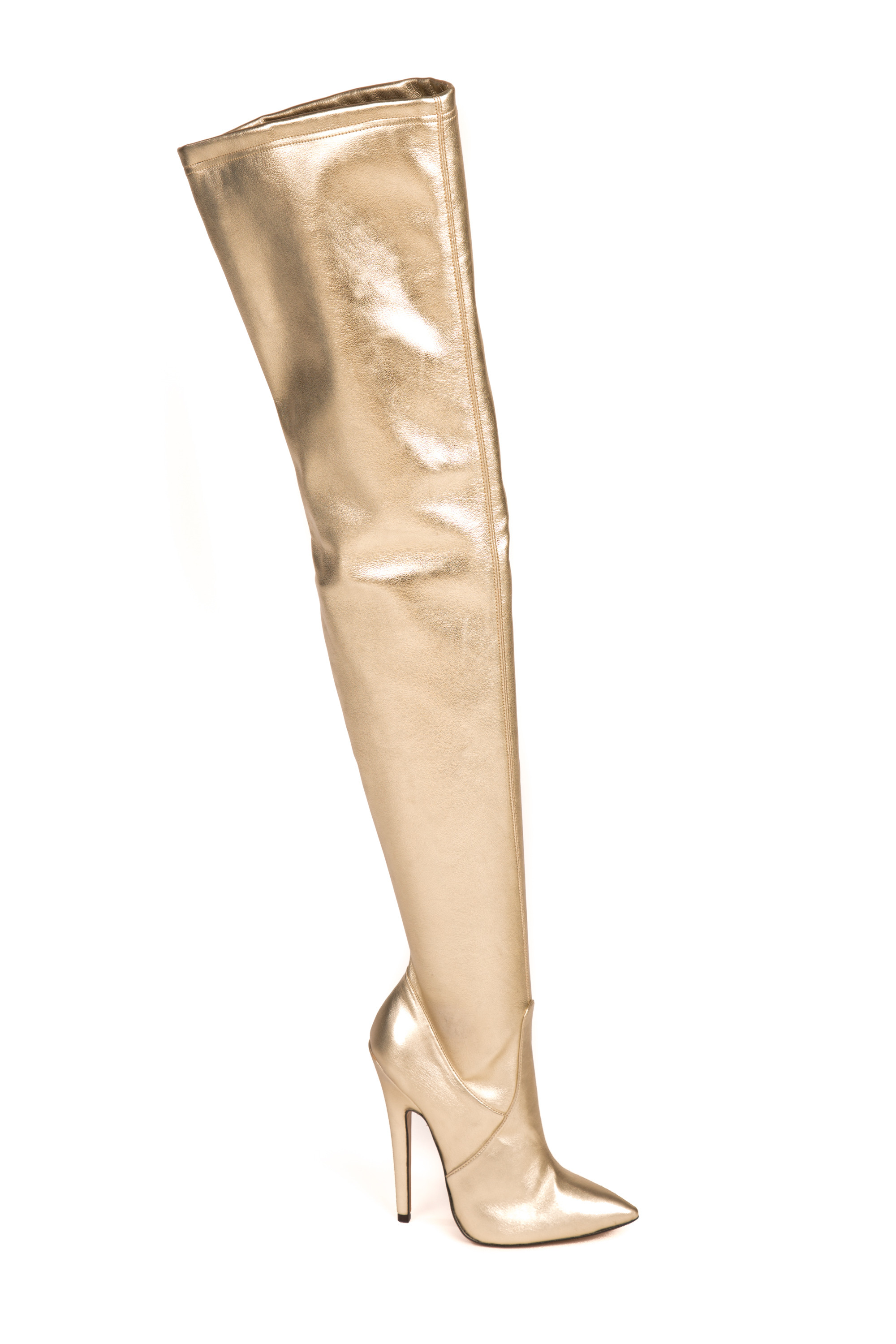 Stivale a coscia in tessuto stretch. Disponibile nelle varianti: tessuto scamosciato rosso e tessuto laminato platino. Tacco laccato in tinta. Suola tunit.
