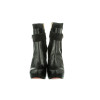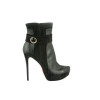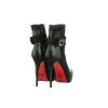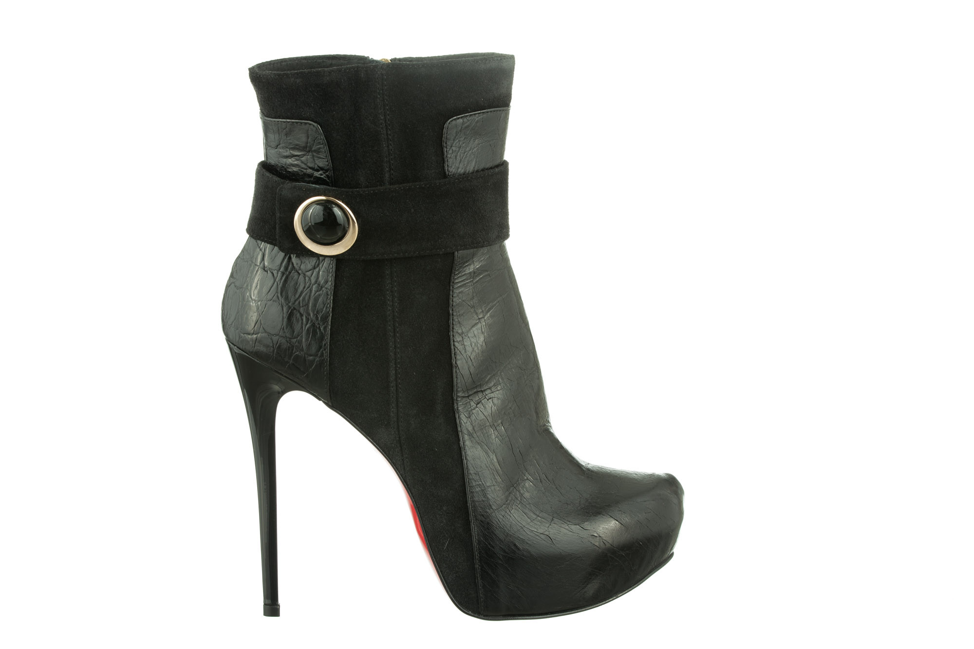 Tronchetto in pelle tipo cocco nero e camoscio nero. Cinturino in camoscio con accessorio bottone. Tacco laccato nero. Plateau 4 cm. Suola rossa tunit con stampa floreale nera.