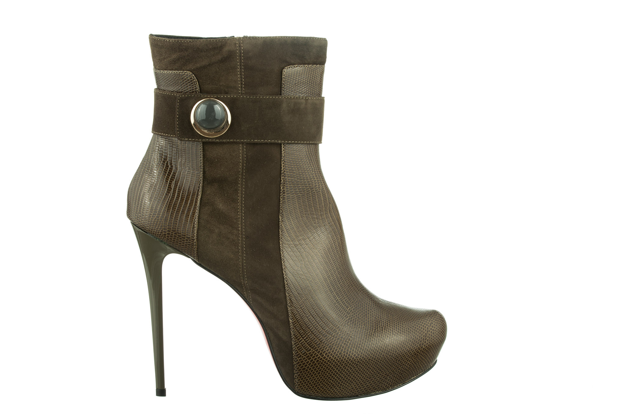 Tronchetto in pelle tipo cocco verde e camoscio verde. Cinturino in camoscio con accessorio bottone. Tacco laccato verde. Plateau 4 cm. Suola rossa tunit con stampa floreale nera.