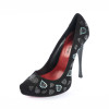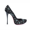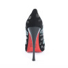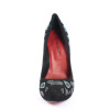 Décolleté in camoscio nero con applicazione di strass bianchi e azzurri. Plateau interno. Tacco laccato nero. Suola tunit rossa con stampa floreale nera.